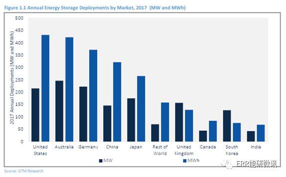2017年是儲能領域最激動人心的年份之一,多個市場出現(xiàn)了形成性的政策發(fā)展、有趣的商業(yè)模式以及一股企業(yè)的兼并和收購活動。2017年,全球共部署了1.4吉瓦和2.3吉瓦小時的儲能,其中澳大利亞在電力容量方面處于領先位置,達到246兆瓦,而美國市場在能源容量方面領先全球,達到431兆瓦時。