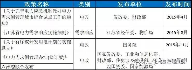 結(jié)合新一輪電力體制改革以及配套文件的發(fā)布,輔助服務(wù)和電力需求側(cè)管理(需求響應(yīng))領(lǐng)域出臺(tái)的一系列政策都為儲(chǔ)能參與電力系統(tǒng)的服務(wù)提供依據(jù)和支持。這些政策對(duì)于提升儲(chǔ)能在輔助服務(wù)和用戶側(cè)應(yīng)用的經(jīng)濟(jì)性有較大的作用,政策制定與市場(chǎng)發(fā)展形成了良性的互動(dòng)。下邊兩個(gè)表對(duì)相關(guān)政策進(jìn)行了梳理和總結(jié)。