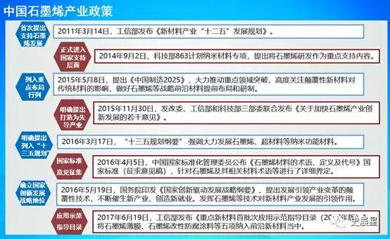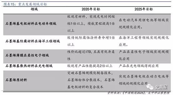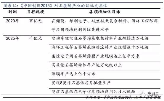 《中國制造 2025》明確了石墨烯發(fā)展目標(biāo),2020 年“規(guī)模制備及電化學(xué)儲(chǔ)能、印刷電子、航空航天用輕質(zhì)高強(qiáng)復(fù)合材料、海洋工程防腐等應(yīng)用領(lǐng)域的技術(shù)水平達(dá)國際領(lǐng)先,大幅提升相關(guān)產(chǎn)品性能,形成百億元產(chǎn)業(yè)規(guī)模,2025 年突破石墨烯在電子信息領(lǐng)域應(yīng)用的技術(shù)瓶頸,整體產(chǎn)業(yè)規(guī)模突破千億。