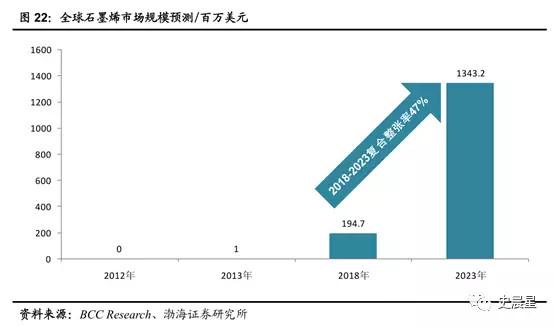 但石墨烯作為基礎(chǔ)材料,下游應(yīng)用領(lǐng)域極為廣闊,美國 BCC Research 預(yù)測(cè),2018 年全球石墨烯整體市場(chǎng)規(guī)??赡芨哌_(dá) 1.95 億美元,2023年石墨烯應(yīng)用規(guī)模將達(dá)到 13.43 億美元,復(fù)合增長率 47%。