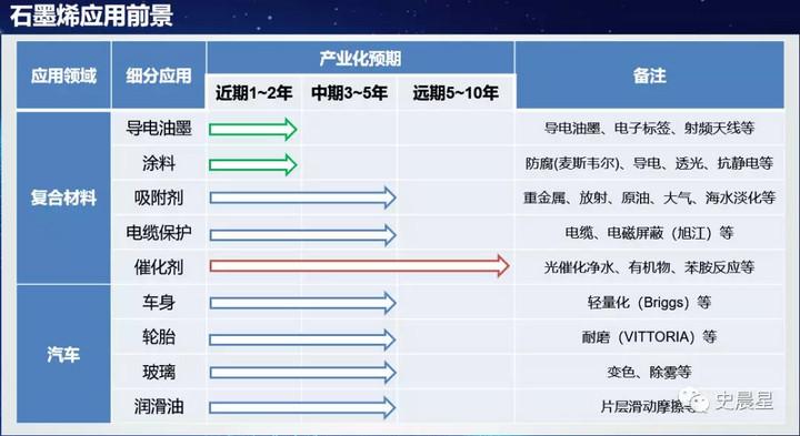 綜合考量石墨烯在各個(gè)下游領(lǐng)域的技術(shù)研究迚展、政策引導(dǎo)方向以及下游市場(chǎng)的接受度,我們認(rèn)為石墨烯產(chǎn)業(yè)爆發(fā)點(diǎn)已初步形成,未來將逐步在各個(gè)細(xì)分領(lǐng)域分階段釋放。