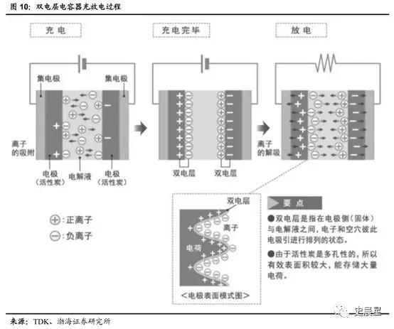 超級(jí)電容器可以被視為懸浮在電解質(zhì)中的兩個(gè)無反應(yīng)活性的多孔電極板,在極板上加電,正極板吸引電解質(zhì)中的負(fù)離子,負(fù)極板吸引正離子,形成兩個(gè)容性存儲(chǔ)層。