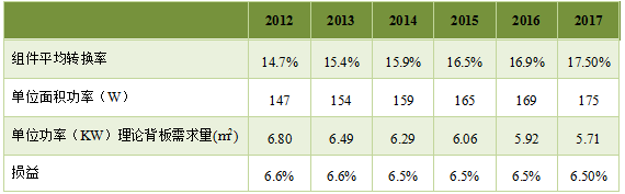 圖表:2012-2017年國內(nèi)太陽能背板需求統(tǒng)計分析(單位:W,m2/kw,GW,萬m2)