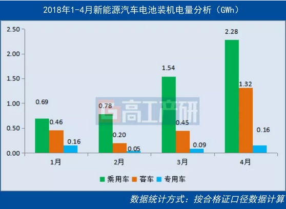 中國(guó)儲(chǔ)能網(wǎng)訊:高工產(chǎn)業(yè)研究院(GGII)最新數(shù)據(jù)統(tǒng)計(jì)顯示,2018年4月我國(guó)新能源汽車生產(chǎn)約8.7萬(wàn)輛,同比增長(zhǎng)148%,動(dòng)力電池裝機(jī)總電量約3.76GWh,同比增長(zhǎng)304%。