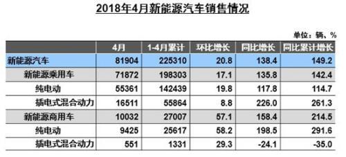 中國(guó)儲(chǔ)能網(wǎng)訊:本周,中汽協(xié)與中國(guó)充電聯(lián)盟相繼發(fā)布新能源汽車市場(chǎng)數(shù)據(jù)。根據(jù)中汽協(xié)發(fā)布2018年4月份汽車產(chǎn)銷數(shù)據(jù)顯示,今年4月新能源汽車產(chǎn)銷量分別為8.1萬(wàn)輛和8.2萬(wàn)輛,同比增長(zhǎng)分別為117.7%和138.4%;1-4月累計(jì)銷售新能源汽車22.5萬(wàn)輛,同比增長(zhǎng)149.2%。