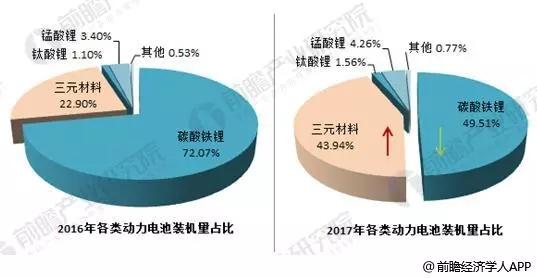 從動(dòng)力鋰電池的類型來看,主要分為碳酸鐵鋰、三元材料、鈦酸鋰、錳酸鋰和其他?,F(xiàn)階段以碳酸鐵鋰和三元材料為動(dòng)力鋰電池的主要裝機(jī)類型。但是相比于2016年,2017年三元材料動(dòng)力電池的裝機(jī)量占比有較大幅度的提升,占比達(dá)43.94%,而碳酸鐵鋰裝機(jī)量下降至49.51%。