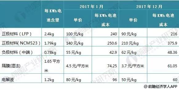 圖表10:2017年中國動(dòng)力鋰電池材料成本分析(單位:元/kg,元/平方米)