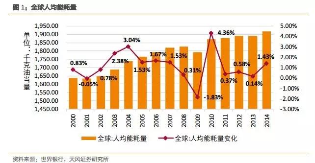 全球能源需求增長緩慢,能源轉(zhuǎn)型推動新能源快速發(fā)展,能源消費結(jié)構(gòu)清潔化趨勢明顯。近年來,全球經(jīng)濟(jì)增速進(jìn)一步放緩,主要經(jīng)濟(jì)體走勢分化,發(fā)達(dá)國家經(jīng)濟(jì)緩慢復(fù)蘇,新興經(jīng)濟(jì)體國家經(jīng)濟(jì)發(fā)展有所改善。人均能耗量在2014年達(dá)到了1919.43千克油當(dāng)量,較2000年的1636.60千克油當(dāng)量上升了17.28%。但是從2004年以來,除了2010年人均能耗量出現(xiàn)增加外,人均能耗呈現(xiàn)增速放緩的狀態(tài),。自2010年以來,全球人均能耗量增速從4.36%明顯下降至1.43%并保持穩(wěn)定。