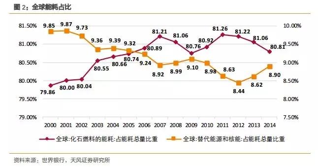 在能源消耗結(jié)構(gòu)來看,化石燃料能耗占比在2000年前不斷增加,而從2011年的81.26%開始下降,至2014年減少到了80.81%;相對而言,替代能源和核能的占比則在這四年間也從8.44%一路穩(wěn)步增加至8.90%。雖然增減幅度還較小,但從中可見清潔化趨勢在逐漸加強。