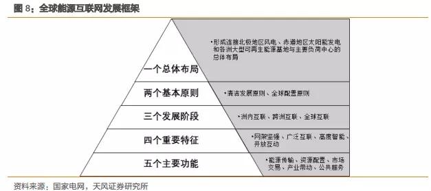 全球能源互聯(lián)網(wǎng)的發(fā)展框架可以概括為一個總體布局、兩個基本原則、三個發(fā)展階段、四個重要特征、五個主要功能。全球能源互聯(lián)網(wǎng)將形成由跨州電網(wǎng)、跨國電網(wǎng)、國家泛在智能電網(wǎng)組成,各層級電網(wǎng)協(xié)調(diào)發(fā)展的總體布局,堅持清潔發(fā)展和全球配置兩個基本原則,經(jīng)過洲內(nèi)互聯(lián)、跨洲互聯(lián)、全球互聯(lián)三個階段,具備網(wǎng)架堅強、廣泛互聯(lián)、高度智能、開放互動四個重要特征,實現(xiàn)能源傳輸、資源配置、市場交易、產(chǎn)業(yè)帶動和公共服務(wù)五個主要功能。