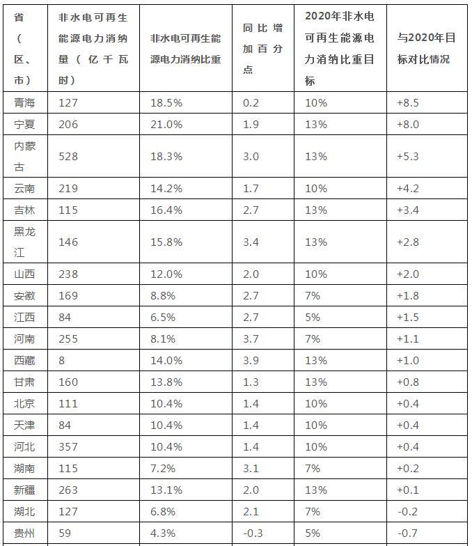 寧夏。2017年,全部可再生能源電力消納量有較大幅度提高,達到225億千瓦時,占本省全社會用電量的比重為23.0%,同比上升1.9個百分點;非水電可再生能源電力消納量為206億千瓦時,占本省全社會用電量的比重為21.0%,同比上升1.9個百分點。風(fēng)電和光伏發(fā)電均未達到最低保障收購年利用小時數(shù)要求,偏差分別為-200小時和-174小時。