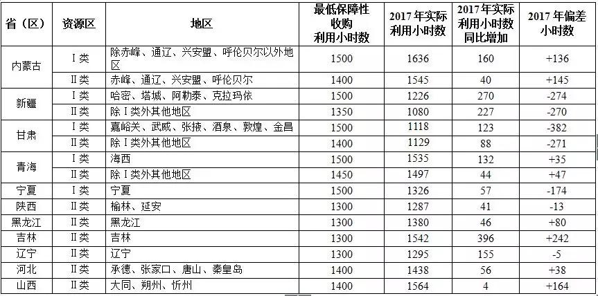 2017年,全部規(guī)定風(fēng)電最低保障收購年利用小時數(shù)的地區(qū)的風(fēng)電實際發(fā)電小時數(shù)較2016年均增加,但新疆Ⅲ類資源區(qū)、甘肅、寧夏、吉林Ⅲ類資源區(qū)未達到風(fēng)電最低保障收購年利用小時數(shù)要求。其中,甘肅Ⅱ類和Ⅲ類資源區(qū)實際利用小時數(shù)與最低保障收購年利用小時數(shù)偏差分別為-305小時和-383小時;寧夏由于來風(fēng)情況偏差,偏差為-200小時;新疆Ⅲ類資源區(qū)和吉林Ⅲ類資源區(qū)偏差分別為-116小時和-112小時。其他地區(qū)達到風(fēng)電最低保障收購年利用小時數(shù)要求。