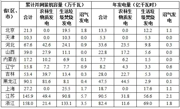 截至2017年底,全國共有30個?。▍^(qū)、市)投產(chǎn)了747個生物質(zhì)發(fā)電項目,并網(wǎng)裝機容量1476.2萬千瓦(不含自備電廠),年發(fā)電量794.5億千瓦時。其中農(nóng)林生物質(zhì)發(fā)電項目271個,累計并網(wǎng)裝機700.9萬千瓦,年發(fā)電量397.3億千瓦時;生活垃圾焚燒發(fā)電項目339個,累計并網(wǎng)裝機725.3萬千瓦,年發(fā)電量375.2億千瓦時;沼氣發(fā)電項目137個,累計并網(wǎng)裝機50.0萬千瓦,年發(fā)電量22.0億千瓦時。生物質(zhì)發(fā)電累計并網(wǎng)裝機排名前四位的省份是山東、浙江、江蘇和安徽,分別為210.7萬、158.0萬、145.9萬和116.3萬千瓦;年發(fā)電量排名前四位的省份是山東、江蘇、浙江和安徽,分別是106.5億、90.5億、82.4億和66.2億千瓦時。2017年各?。▍^(qū)、市)各類生物質(zhì)發(fā)電并網(wǎng)裝機及發(fā)電量如下: