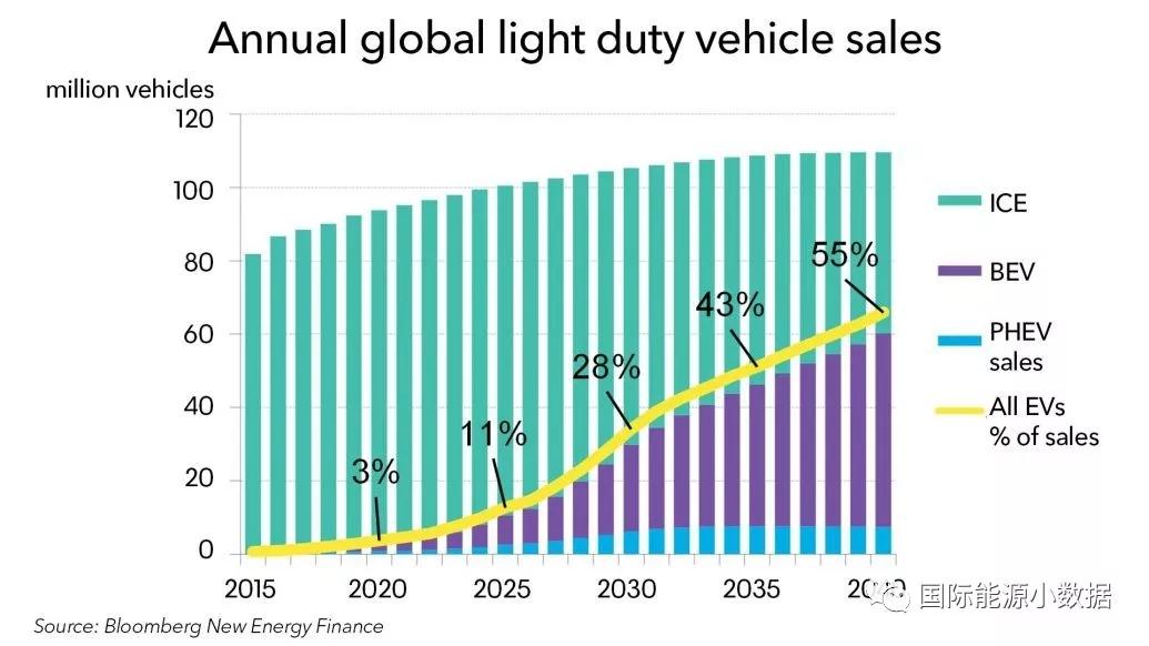 BNEF預(yù)計(jì)2040年全球輕型電動(dòng)汽車的銷量可達(dá)6000萬(wàn)輛,占當(dāng)年汽車銷量的55%,也就是說(shuō)屆時(shí)燃油汽車的銷售比例仍然有45%。從存量的角度看,2040年電動(dòng)汽車總量可達(dá)5.59億輛,在全球汽車存量中只占33%。2040年電動(dòng)汽車的耗電量可達(dá)2000TWh(2萬(wàn)億千瓦時(shí)),約占全球電力需求的6%,相當(dāng)于石油需求將減少730萬(wàn)桶/天。
