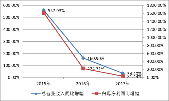 但新浪財經(jīng)發(fā)現(xiàn),在經(jīng)歷了營收凈利暴漲之后,目前公司增長趨勢出現(xiàn)放緩,2016年營收與歸母凈利同比增幅分別為160.90%與224.71%,到2017年其同比增幅僅為34.40%與31.44%,同時,其2015年、2016年及2017年的綜合毛利率分別為38.64%、43.70%和36.29%,毛利率在2017年也出現(xiàn)下滑。
