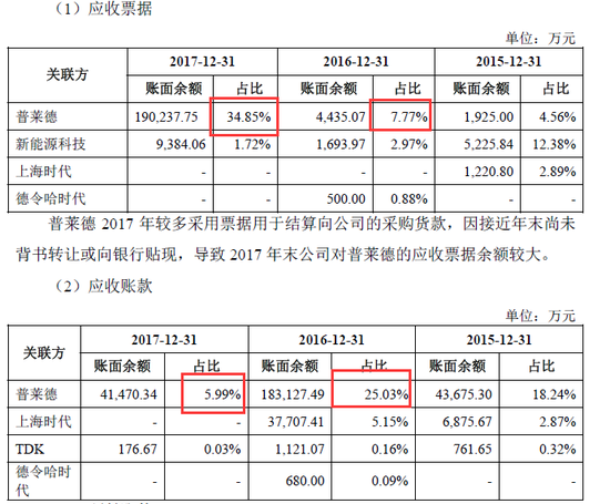 值得一提的是,寧德時代除了給普萊德享受售價“折扣”,還給其很大比例的賒欠結(jié)算貨款方式,2016年普萊德的應(yīng)收賬款占比約25%,約為18億元,2017年對其應(yīng)收票據(jù)占比約為35%,金額約為19億元。