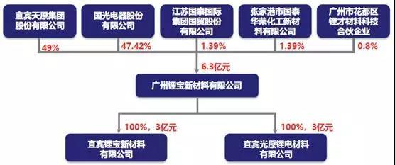 2014年,國光集團(tuán)與江蘇國泰集團(tuán)合作,正式成立廣州鋰寶,注冊(cè)資金7000萬;2017年,引入新股東四川宜賓天原集團(tuán),對(duì)廣州鋰寶進(jìn)行增資,注冊(cè)資金達(dá)6.3億元;在四川宜賓成立宜賓鋰寶和宜賓光原鋰電材料有限公司兩個(gè)子公司,如今股權(quán)結(jié)構(gòu)如下: