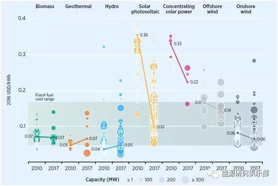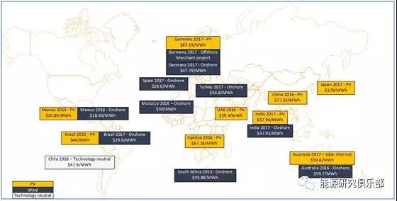 圖9 全球2017風(fēng)電、光伏項(xiàng)目招標(biāo)價(jià)格分布情況