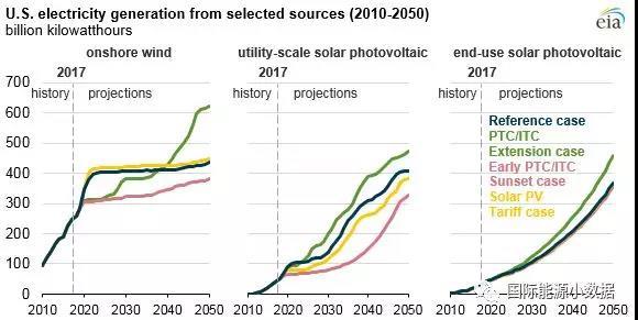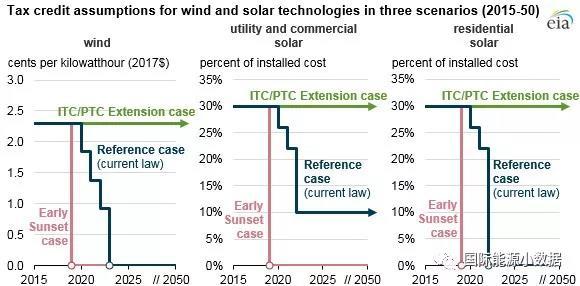 美國ITC和PTC兩種補(bǔ)貼措施的未來走向如何?按照現(xiàn)有法律,陸上風(fēng)電的PTC在2017年以后逐年下降20%,2019年以后開建(一般4年完工)的風(fēng)電項目完全不享受PTC優(yōu)惠。針對太陽能的ITC優(yōu)惠自2020年起逐年下降,大型光伏的優(yōu)惠從30%最終降至10%,而居民屋頂光伏到2022年以后完全取消。美國的可再生能源補(bǔ)貼走向也取決于兩黨政治的平衡,也有可能出現(xiàn)提前在2019年全部取消稅收減免或者到2050年一直維持現(xiàn)有稅負(fù)減免兩種極端情況。這樣ITC和PTC的未來走向就有以下三種情景:1)按照現(xiàn)有法律稅負(fù)減免幅度逐步退坡(參考情景);2)2019年提前終結(jié)所有稅收減免;3)到2050年一直維持現(xiàn)有稅收減免幅度。