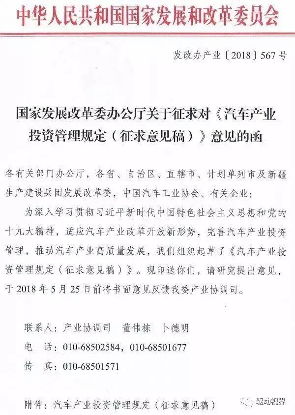 5 月 25 日下午,國家發(fā)改委辦公廳發(fā)布了《汽車產(chǎn)業(yè)投資管理規(guī)定(征求意見稿)》(以下簡稱《征求意見稿》)?!墩髑笠庖姼濉访魑囊?guī)定: