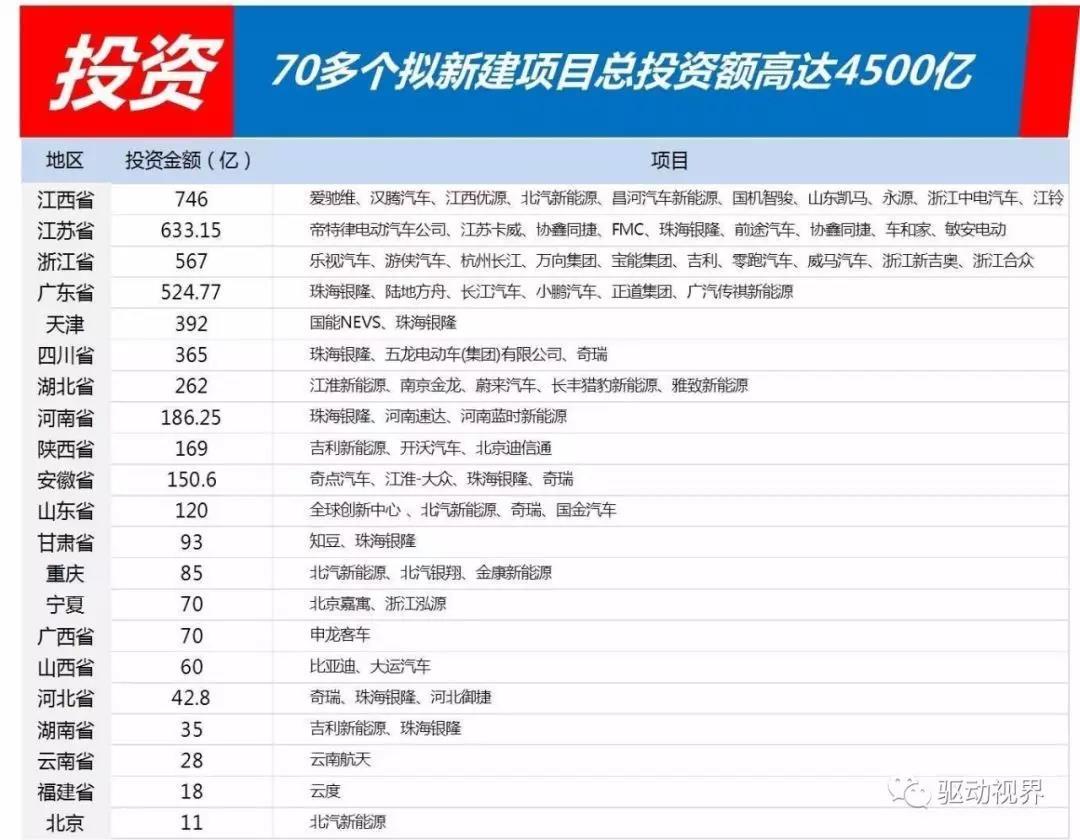 這些項(xiàng)目分布在全國 21 個(gè)省市,其中江西省、江蘇省、浙江省、廣東省最為活躍,投資主體有汽車界老面孔,更多的是新進(jìn)入者。當(dāng)然名單中也有像珠海銀隆這樣的特色企業(yè),擬在天津、江蘇、廣東、四川、河南、甘肅等 9 個(gè)省市投資近千億搞新能源汽車。