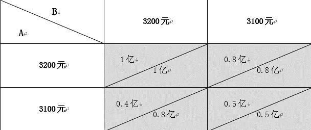 兩家公司還估計(jì)出,如果其中一家公司把價(jià)格降低100元,而另一家的價(jià)格保持不變,那么降價(jià)的公司將額外得到6家客戶就是30萬(wàn)千瓦的容量,而另一家公司將減少6家客戶只能得到4家客戶也就是20萬(wàn)千瓦的中標(biāo)容量。因此每家公司都有動(dòng)機(jī)制定低于對(duì)方公司的價(jià)格,以獲得更多的中標(biāo)容量。我們做出這種假設(shè)的主要目的就是找出這些動(dòng)機(jī)是如何影響雙方的行動(dòng)的。