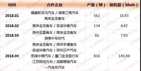 那么,是什么讓億緯鋰能的動力電池裝機量在4月發(fā)生華麗反轉(zhuǎn)?經(jīng)研究我們發(fā)現(xiàn),億緯鋰能的增長源于合作企業(yè)的增多和配套南京金龍客車的數(shù)量上升,尤其是配套南京金龍客車數(shù)量的急劇上升。4月合作的企業(yè)由年初的3家企業(yè)增長到9家企業(yè),配套車輛由年初的562臺增長到4月的816臺,裝機電量由16.93Mwh增長到了145.94Mwh;4月配套南京金龍客車611臺,裝機電量為124.76Mwh。同時從下圖我們不難發(fā)現(xiàn),億緯鋰能在4月進(jìn)入了宇通客車電池配套體系。一向由寧德時代供貨為主的宇通客車,在4月10.27%的動力電池裝機量由億緯鋰能提供。
