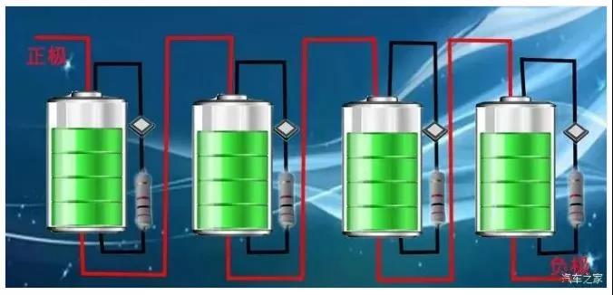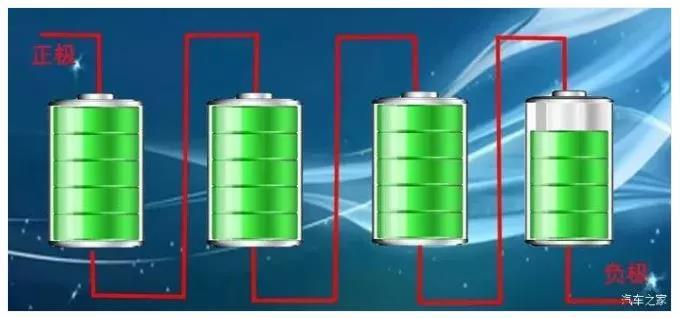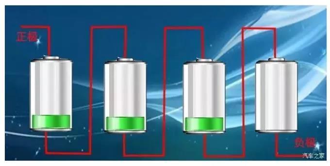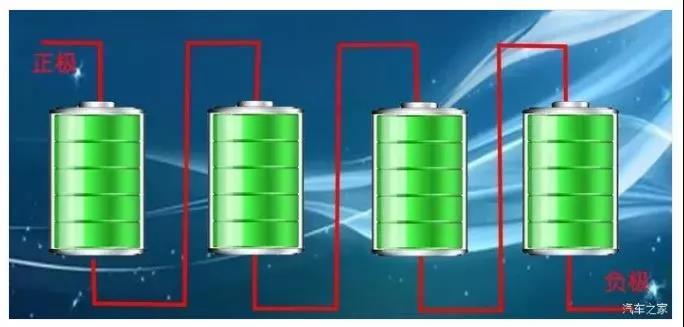 連接方式為串聯(全部電芯串聯),串聯的電池如下圖,形象一點說,就是類似于我們以前用過的手電筒,幾個電池頭尾相接。