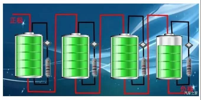 那么一旦產生了不均衡,怎么辦呢?這就要用到電池管理系統的均衡模塊。唐和秦的均衡模塊采用的是被動均衡方式,也就是說,通過旁路電阻給電壓較高的電芯放電,使其達到和其他電芯相同的電壓。也就是這樣: