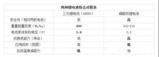 首先我們來談談唐和秦的電池,型號應該是一樣的,只是秦的電池組電芯數量比較少,容量13度,唐的比較多,18度。單個的電芯都是比亞迪自己制造的磷酸鐵鋰電池,額定電壓3.2V,容量26AH。為什么不是最近比較火的三元鋰電池呢?原因如下圖: