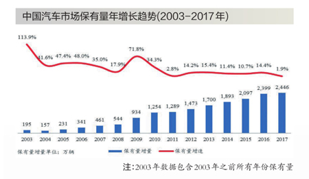 從2017年底的中國(guó)汽車市場(chǎng)保有量增長(zhǎng)趨勢(shì)來(lái)看,2009年新購(gòu)的汽車仍有934萬(wàn)輛活躍于市場(chǎng),而之后每年增長(zhǎng)均在千萬(wàn)輛以上,2015年之后更是超過(guò)了2000萬(wàn)輛。
