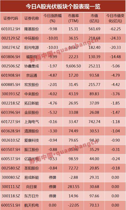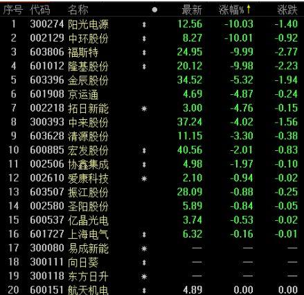 今日,A股方面,陽(yáng)光電源、中環(huán)股份、福斯特和隆基股份等4只光伏龍頭股,在開(kāi)盤(pán)后便迅速跌停,直至收盤(pán)跌停板仍未打開(kāi)。整體來(lái)看,光伏板塊共計(jì)20只個(gè)股:3只停牌,16只下跌,1只平盤(pán),無(wú)1只上漲。