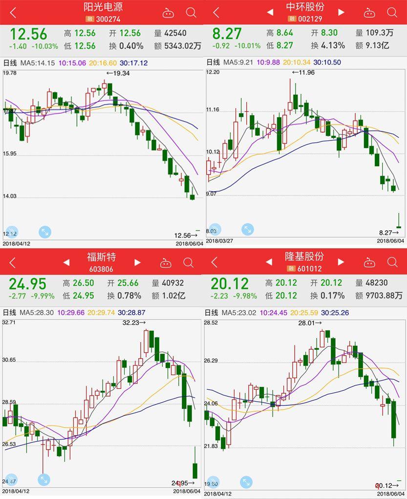 今天(6月4日),A股光伏板塊全線下挫,陽(yáng)光電源、中環(huán)股份、福斯特和隆基股份等4只光伏龍頭股,在開(kāi)盤(pán)后便迅速跌停,直至收盤(pán)跌停板仍未打開(kāi)。