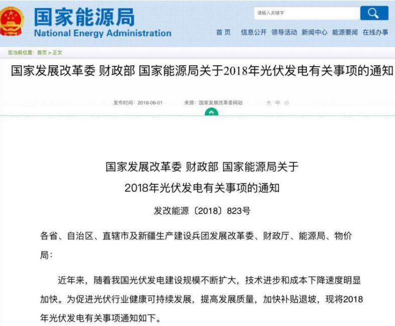 6月1日,國(guó)家能源局在官網(wǎng)表示,為促進(jìn)光伏行業(yè)健康可持續(xù)發(fā)展,提高發(fā)展質(zhì)量,加快補(bǔ)貼退坡,印發(fā)《關(guān)于2018年光伏發(fā)電有關(guān)事項(xiàng)的通知》,即俗稱光伏新政。