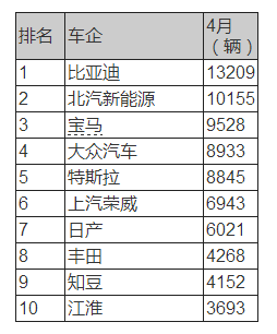 北汽EC系列成為當(dāng)月最暢銷車型排行冠軍,銷量為7471輛,同比增加72%。排在第二的是日產(chǎn)聆風(fēng)(Leaf),較3月份的創(chuàng)紀(jì)錄水平下降了47%,但是5941輛的銷量成績?nèi)员热ツ晖诖笤?7%。資料來源:EVSALES