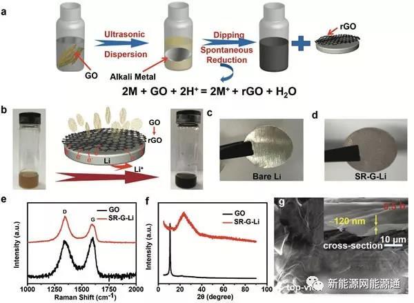 中國儲能網(wǎng)訊:近日西北工業(yè)大學(xué)的MaohuiBai(第一作者)和Keyu Xie(通訊作者)通過采用金屬Li直接還原氧化石墨烯GO的方法在金屬Li的表面生成了一層還原石墨層,石墨烯層的存在能夠很好的抑制Li枝晶的生長,同時穩(wěn)定SEI墨提高庫倫效率,石墨烯層的存在還能夠顯著的改善金屬Li的倍率性能,實驗表明該電極能夠在5mA/cm2的電流密度下在LiPF6——碳酸酯類電解液中循環(huán)1000次而不發(fā)生短路。