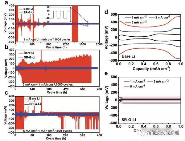 從下圖d和e中我們對比在不同的電流密度下金屬Li負(fù)極的電壓平臺能夠發(fā)現(xiàn),當(dāng)電流密度從1mA/cm2提高到5mA/cm2,沒有石墨烯涂層的金屬Li負(fù)極電壓平臺從54.3mV大幅增大到了449.2mV,而采用石墨烯涂層保護(hù)的金屬Li負(fù)極僅僅從19.2mV增加到79.3mV,表明石墨烯涂層能夠顯著的降低金屬Li負(fù)極的極化。
