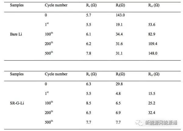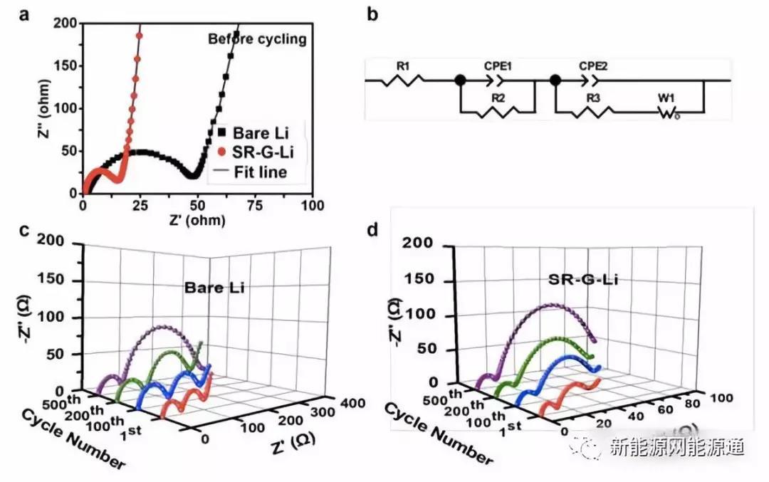 石墨涂層提升金屬Li負(fù)極循環(huán)性能的原因能夠從EIS分析中得到,通過對比在1mA/cm2的電流密度下循環(huán)1,100,200和500次的EIS測試結(jié)果,我們能夠發(fā)現(xiàn)石墨烯涂層的金屬Li負(fù)極表面SEI膜阻抗Rf和電荷交換阻抗RCT要明顯低于沒有涂層的,并且循環(huán)過程中有石墨烯涂層保護(hù)的金屬Li負(fù)極的阻抗增加速度也要明顯慢于普通的金屬Li負(fù)極,表明石墨烯涂層能夠幫助金屬Li負(fù)極形成更加穩(wěn)定的SEI膜,減緩循環(huán)過程中SEI膜的生長。