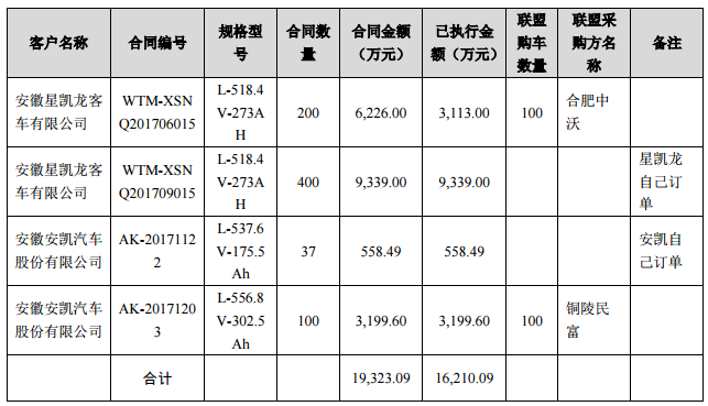 深交所:2017年3月,公司披露了沃特瑪分別與安徽星凱龍客車、安徽安凱汽車簽訂的兩份戰(zhàn)略合作協(xié)議,根據(jù)協(xié)議沃特瑪創(chuàng)新聯(lián)盟成員每向安凱汽車采購 1輛純電動汽車,安凱汽車需向沃特瑪購買2組電池,沃特瑪創(chuàng)新聯(lián)盟成員每向星凱龍客車采購1輛純電動汽車,星凱龍客車需向聯(lián)盟成員購買3組電池。請披露上述協(xié)議的實際執(zhí)行情況(包括購買汽車數(shù)量、電池組數(shù)等)