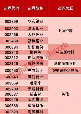 其他關(guān)聯(lián)個股還有:廈門鎢業(yè)、璞泰來、天賜材料、新宙邦、長園集團(tuán)、星源材質(zhì)、海源機(jī)械等。