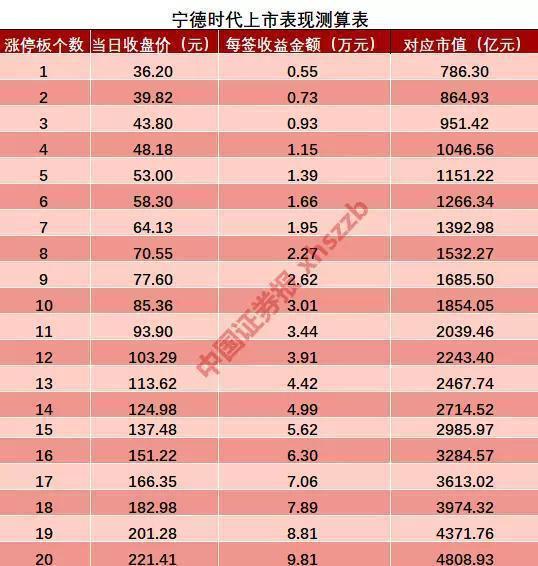 從寧德時代上市股價模擬測算表看,如果收獲10個漲停板,其每簽收益最高可達(dá)3萬元;若與藥明康德一樣收獲16個漲停板,每簽收益最高可達(dá)6.30萬元。