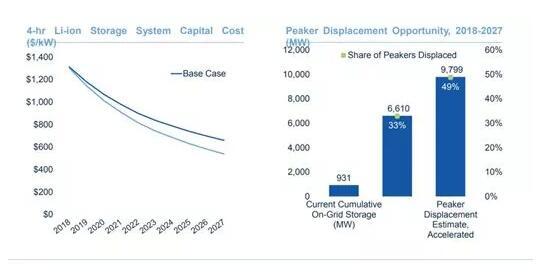 據(jù)上看,當(dāng)前在某些領(lǐng)域鋰離子電池和天然氣峰值電廠之間是可以競爭的,未來幾年這種競爭在美國全國范圍內(nèi)會越來越明顯,隨著成本“瓶頸”的突破,電池在美國將更具優(yōu)勢。