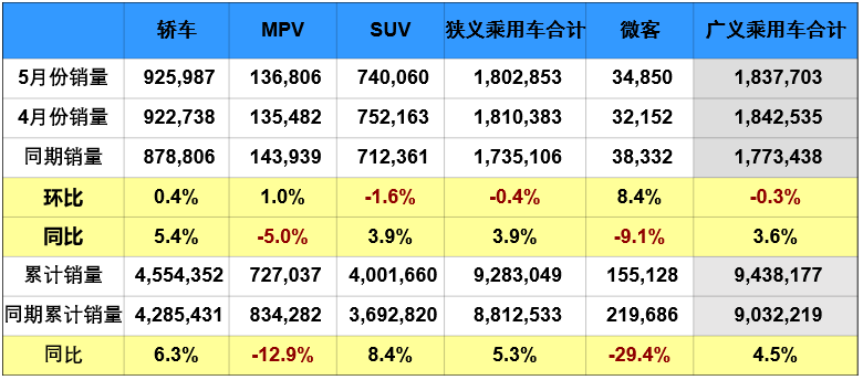 具體到車型方面,5月轎車同環(huán)比均實現(xiàn)增長,這也是車市增長的主要推動力;SUV依然處于同比增長狀態(tài),但增速有所放緩;而MPV稍有起色,銷量環(huán)比實現(xiàn)增長,但同比沒能逃脫下滑的命運。