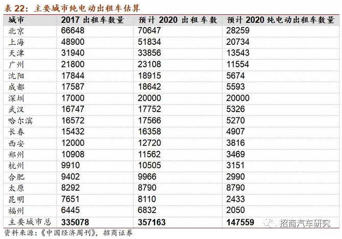 2020年,新能源出租車市場存量或接近30萬輛。2016年底國內(nèi)出租車保有量約140 萬輛,而新能源汽車不到10萬輛,滲透比例7%,如果行業(yè)按照約2%的年增長率計算,2020年,出租車數(shù)量152萬輛,若按照全國20%的電動化滲透率計算,新能源出租車的保有量達(dá)30萬輛,而目前全國新能源出租車不到10萬輛(含純電和插混),仍有較大新增需求量,可見,該市場并非如市場預(yù)期悲觀,仍具備較大滲透空間。