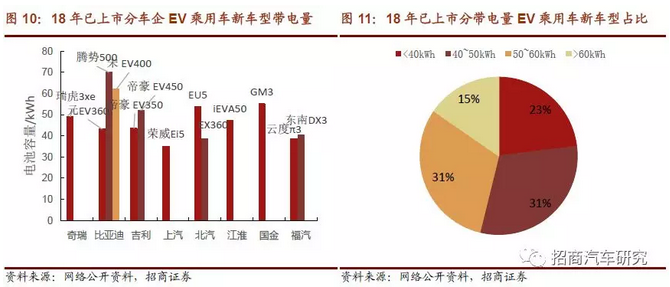 新車型單車帶電量提升明顯。根據(jù)已公布電池容量的車型統(tǒng)計:18年已上市的車型中,比亞迪共推出3款新車型,其中騰勢500(70kWh)、宋 EV400(62kWh)兩款車的帶電量分別為第一和第二。吉利、北汽和福汽均貢獻(xiàn)出2款車型,奇瑞、上汽、江淮和國金帶來1款車型,其中國金GM3是上市EV新車的唯一MPV車型。從帶電量分布來看,40~50kWh的車型有4款(占比31%), 50~60kWh的車型有4款(占比31%)。EV新車型中帶電量40~60kWh的車型共計占比62%,是上市新車型中的主力。