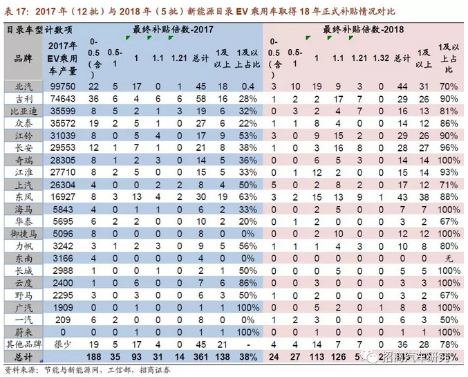 部分車型可以拿到1.2倍以上補(bǔ)貼,兩款車型電池能量密度達(dá)到160wh/kg。根據(jù)目錄統(tǒng)計,2017年的十二批新能源汽車目錄有361款EV乘用車車型獲批,其中按2018年正式補(bǔ)貼的指標(biāo)計算僅有14款車型可以達(dá)到1.1(百公里耗電量超過門檻25%)*1.2(電池能量密度大于140Wh/kg)的補(bǔ)貼系數(shù),享受1倍及以上補(bǔ)貼的車型數(shù)僅占38%;而2018年的五批目錄有EV乘用車343款,1倍及以上補(bǔ)貼車型就有292款,占比85%,更有東風(fēng)俊風(fēng)和廣汽傳祺各一款車型拿到最高1.32倍補(bǔ)貼(電池能量密度達(dá)160Wh/kg以上)??梢娧a(bǔ)貼推動技術(shù)升級趨勢明顯。