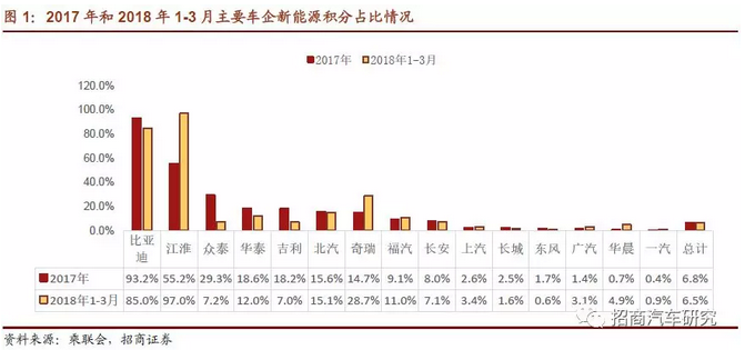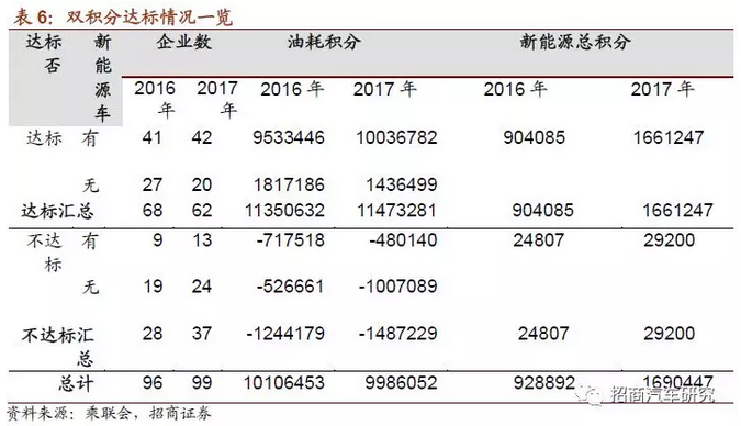 設(shè)定標(biāo)準(zhǔn),雙積分年考強(qiáng)推戰(zhàn)略落地,油耗壓力敦促企業(yè)轉(zhuǎn)型。今年4月,工信部公布了2017年各公司的雙積分情況。數(shù)據(jù)顯示,相較于2016年,2017年的總體油耗標(biāo)準(zhǔn)壓力急劇加大,達(dá)標(biāo)企業(yè)為75家占總體128家的59%。在不達(dá)標(biāo)的企業(yè)中,國產(chǎn)車企業(yè)從16年的64%上升至70%,凸顯了國產(chǎn)車部分企業(yè)油耗達(dá)標(biāo)壓力的急劇增大。從油耗積分角度看,2017年達(dá)標(biāo)企業(yè)正積分1147萬分,相較于16年微增12萬分;而不達(dá)標(biāo)企業(yè)負(fù)積分從16年52萬分上升至100萬分,致使2017年燃油積分不升反降。17年新能源積分主要源自于達(dá)標(biāo)企業(yè),達(dá)標(biāo)企業(yè)貢獻(xiàn)的新能源積分從2016年的90萬分上升至2017年的166萬分;而不達(dá)標(biāo)企業(yè)則僅僅貢獻(xiàn)了2.9萬分的新能源積分。我們認(rèn)為,雙積分的考核有效的區(qū)分了優(yōu)劣產(chǎn)能,隨著19年考核期的臨近,愈演愈烈的兩極分化將迫使不達(dá)標(biāo)企業(yè)迅速轉(zhuǎn)型,或提高合規(guī)新能源汽車產(chǎn)能或更新傳統(tǒng)汽車技術(shù);而針對達(dá)標(biāo)企業(yè),由于傳統(tǒng)燃油車受燃燒效率天花板的制約,為保持積分優(yōu)勢,也將逐步轉(zhuǎn)向或加大新能源汽車產(chǎn)業(yè)的布局。