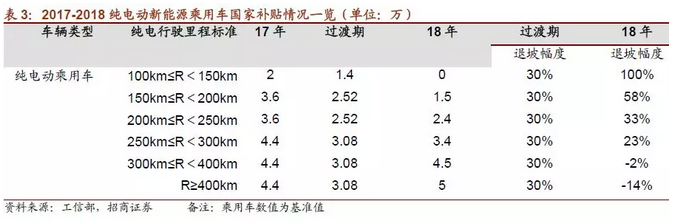 17年A00銷量占比50%,18過渡期搶裝預(yù)期高增速延續(xù)。A00級乘用車?yán)m(xù)航里程集中在150-200km,主要替代低速電動車和限購城市代步需求(遠(yuǎn)低于一線城市牌照價格)。在政府的大力補(bǔ)貼下,A00級憑借價格的優(yōu)勢,在17年迅速爆發(fā),共銷售28.9萬輛,占比總銷量的52%,以2017年上市以來銷量領(lǐng)先的北汽EC180靈動版為例,官方公布的最大續(xù)航里程為180km,市場指導(dǎo)價15.18萬,國家補(bǔ)貼3.6萬,地方補(bǔ)貼1.8萬,廠家補(bǔ)貼4.8萬,終端零售價僅為4.98萬,極具競爭力。但政府也意識到A00靠低價策略開拓市場的方式并不符合制定初衷,不能證明新能源汽車真正具備競爭力,因而在18年補(bǔ)貼新政上大幅削減補(bǔ)貼,但在18上半年設(shè)置過渡期,由于過渡期補(bǔ)貼降幅緩和(-30%),因而上半年A00仍能保持較高增速。