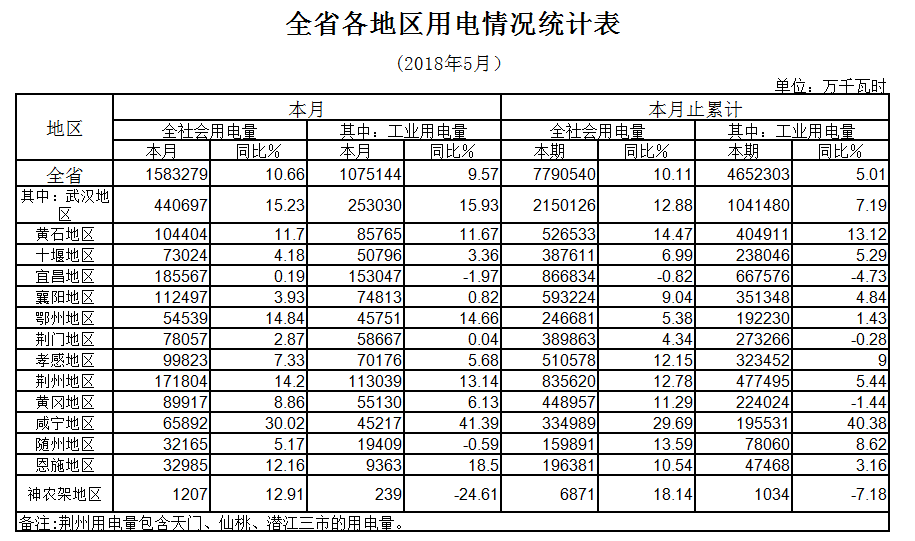 (五)各地區(qū)全社會用電普遍增長,一半地區(qū)用電增速在兩位數(shù)以上。5月份,全省14個用電統(tǒng)計地區(qū)全社會用電普遍增長,其中武漢、黃石、荊州、咸寧等7個地區(qū)全社會用電增幅超過兩位數(shù)。從工業(yè)用電情況看,11個地區(qū)用電不同程度增長,其中武漢等6個地區(qū)工業(yè)用電增速超過兩位數(shù),僅宜昌、隨州、神農(nóng)架林區(qū)3地下降。