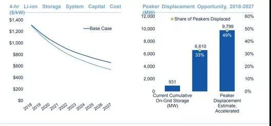 雖然美國(guó)市場(chǎng)當(dāng)前的電儲(chǔ)能不到1GW,但在未來(lái)十年里,它將至少取代三分之一的電量高峰。如果市場(chǎng)增長(zhǎng)更快,那么儲(chǔ)能可能取代近20GW,占調(diào)峰容量的一半。